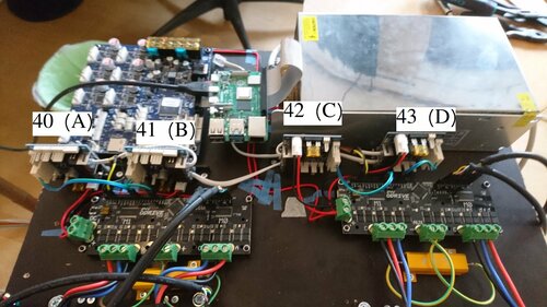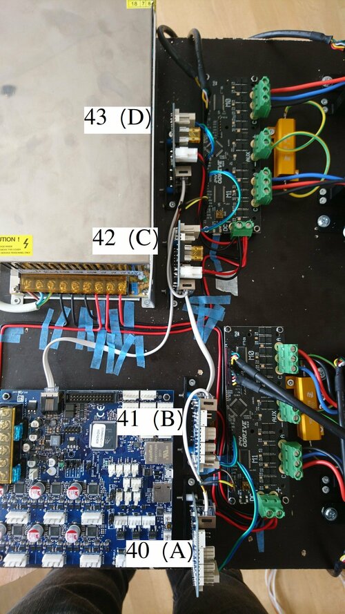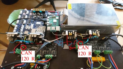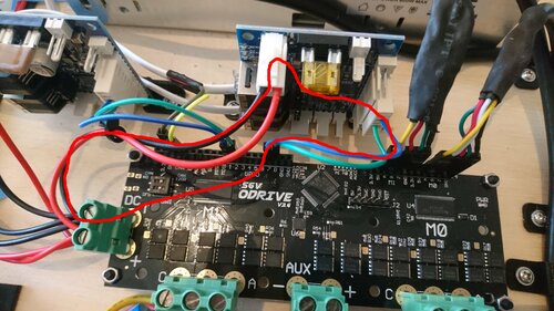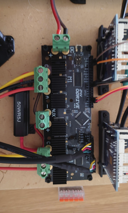 The ODrives' CAN bus also goes inside the white wire, at least on my machine. It goes from the Duet3, through board 43, branches off into one ODrive, the other branch continues through board 42, through board 41, and ends in the second ODrive (left one on the image below). The 1XD boards does not and can not read the ODrives' CAN bus. It just passes straight through the 1XD boards.